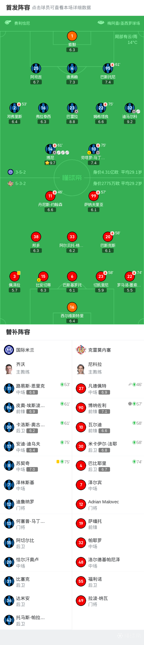 第57分钟,博尼完成助攻帽子戏法,巴雷拉破门,国米4-0领先